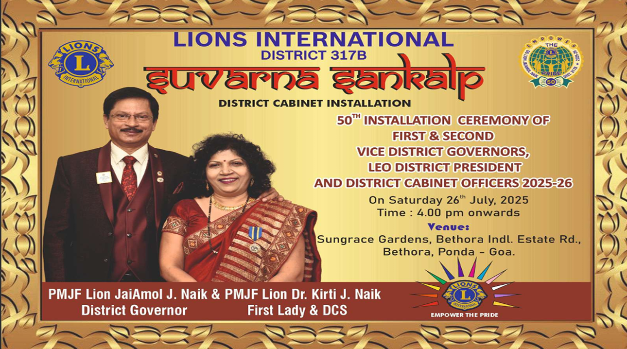 Lions International, District 317B, District Cabinet Installation for the year 2025-26 to be held at at Ponda, Goa, on 26 July 2025, At Hotel Sungrace, Bethora, Ponda